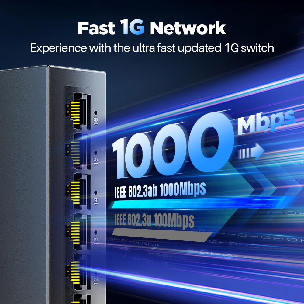 The 16-port Gigabit Ethernet switch adopts high-quality and high-speed network ICs, and this product completely solves the problem of noise of small switches in the office environment through the fanless mute design. This switch has 16 Gigabit RJ45 ports, can provide seamless connection for 10/100/1000M Ethernet, easy to manage and maintain, the product can be widely used in Security network video surveillance, hotel, campus, small and medium-sized enterprise network engineering and other occasions.
