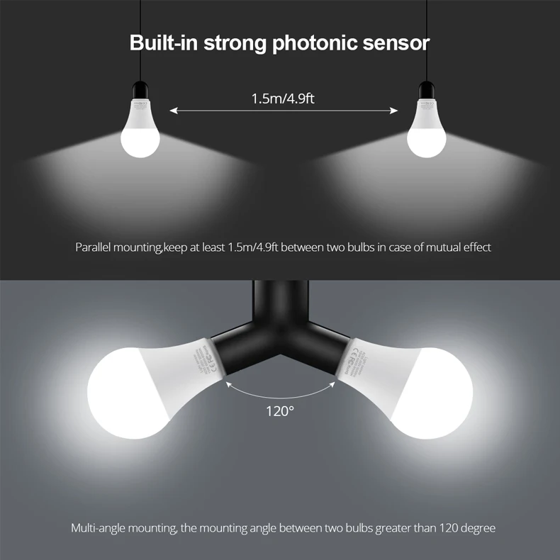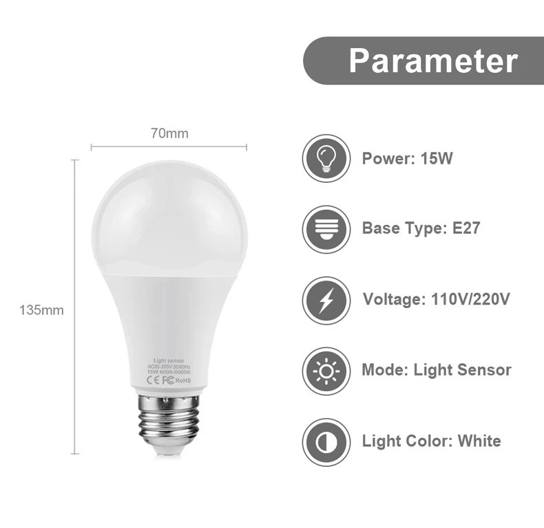 Built-in dusk to dawn sensor: LED bulb with light sensor, automatically turns on at dusk (below 15 Lux), and automatically turns off at dawn (over 40 Lux).