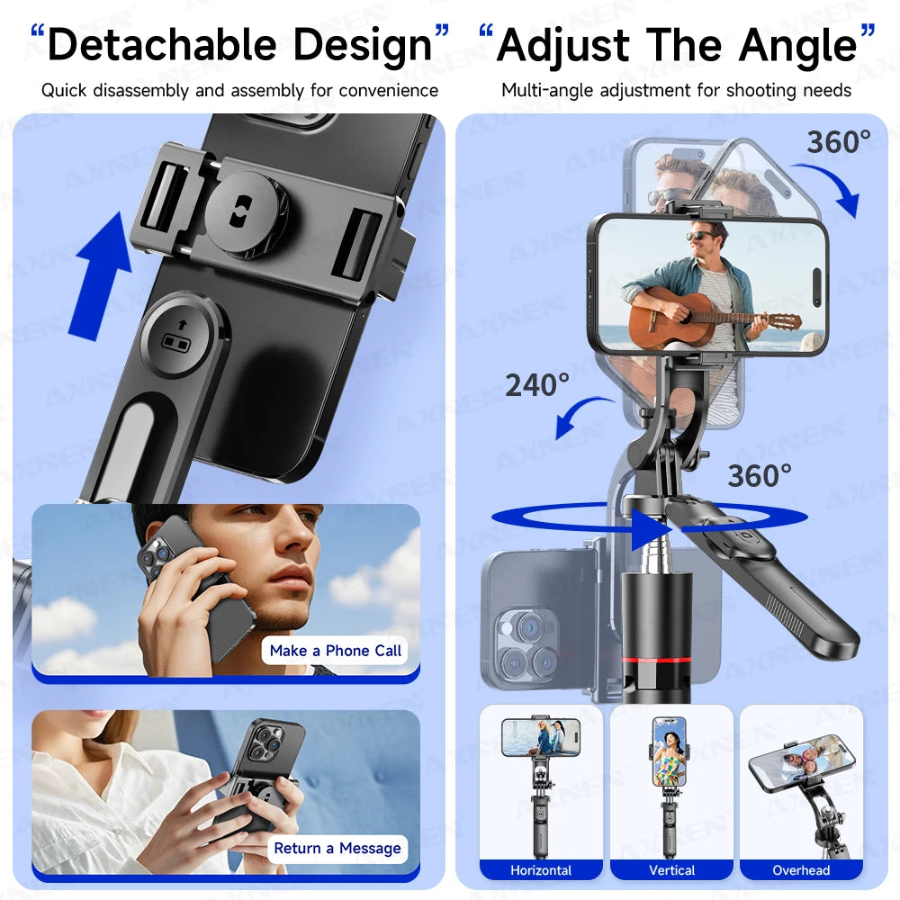 The balance handle supports 360° panoramic shooting, delivering smooth and shake-free visuals. Equipped with a wireless remote, you can record with a single click. The multi-angle adjustment allows horizontal and vertical shooting, while the 1/4 interface is compatible with fill lights, action cameras, and more—perfect for vlogs, live streaming, or travel photos.