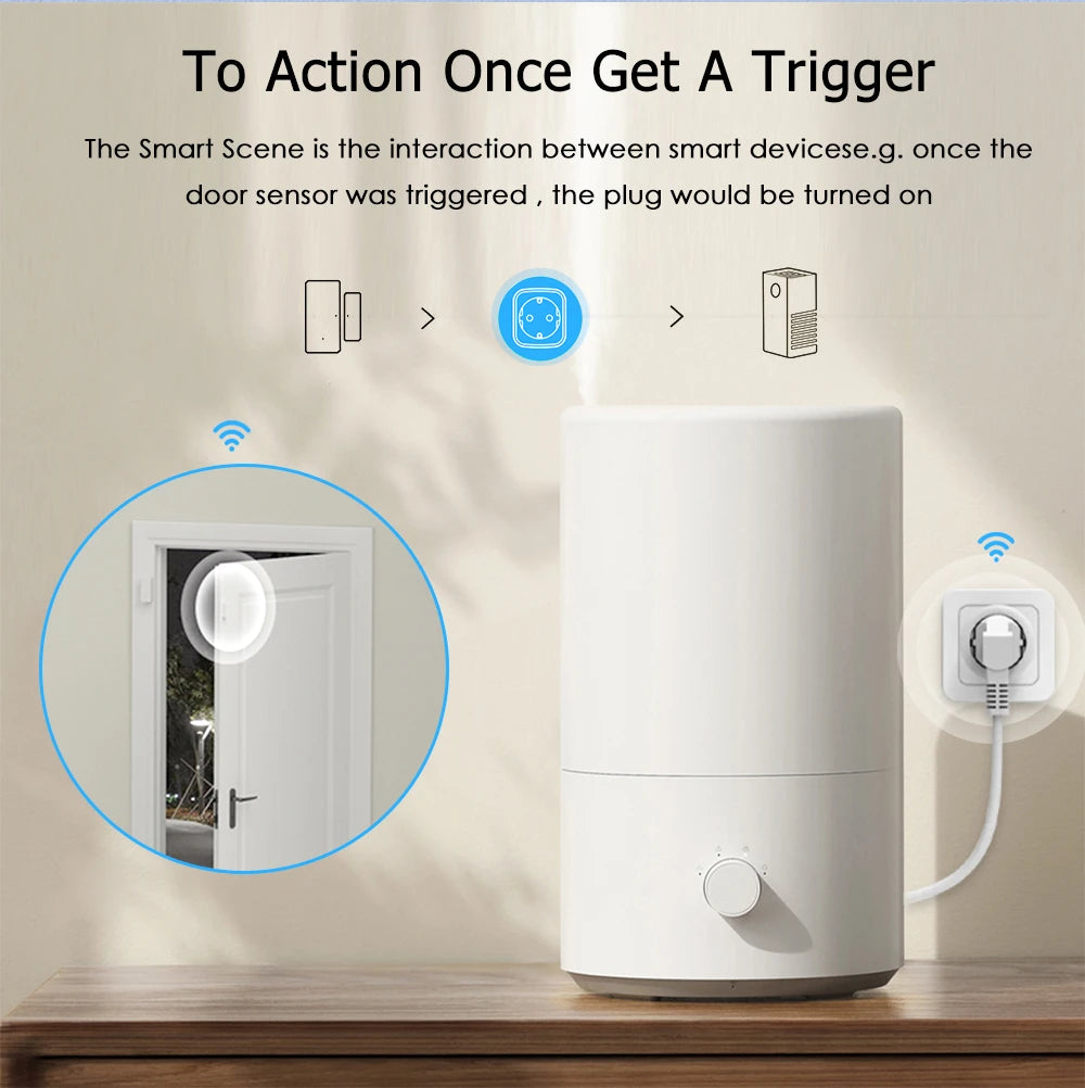 It has a scene setting function. You can choose a suitable scene to run the appliances by start the mode, such as home mode, temperature and humidity or other conditions. For example, if you go home and open the door, you can set the light which connect the power to this smart power plug on and then the camera off.