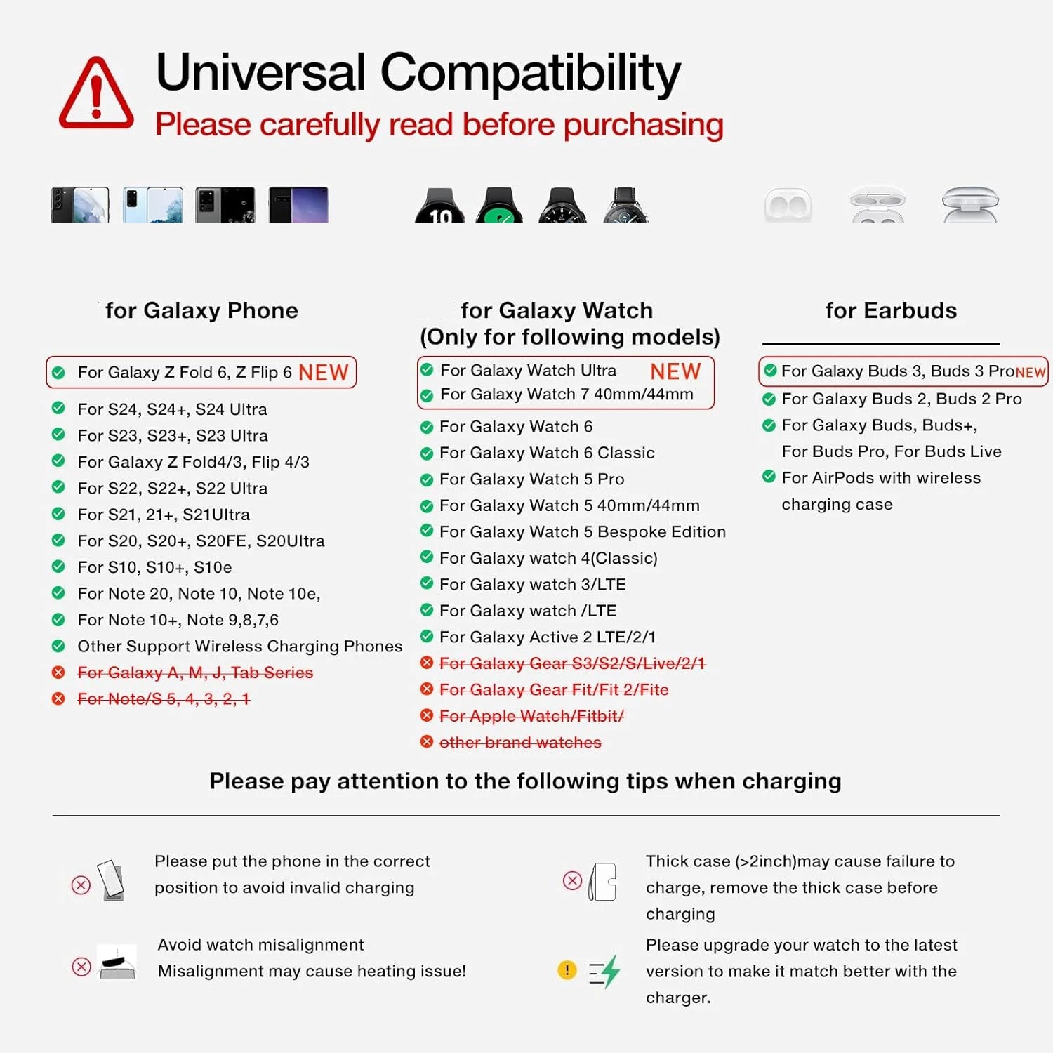 【Widely Compatible】(1) Compatible Phone Models: For Samsung Galaxy S24/S23/S22/S21/S20/S10/S9/S8/S7/S6 Series; Note20/10+/10/9/8/5; For iPhone; Google Pixel; LG and Other Support wireless charging Phones (2) Compatible smartwatch Models: For Galaxy Watch 7/6/5/5 Pro; Galaxy Watch 4/4 Classic; Galaxy Watch 3/LTE; Galaxy Watch; Galaxy Watch Active 2 LTE/ 2/1. (3) Compatible Earphone Models: For Samsung Galaxy Buds/Live; For Apple AirPods Pro/3/2 (With wireless charging case).