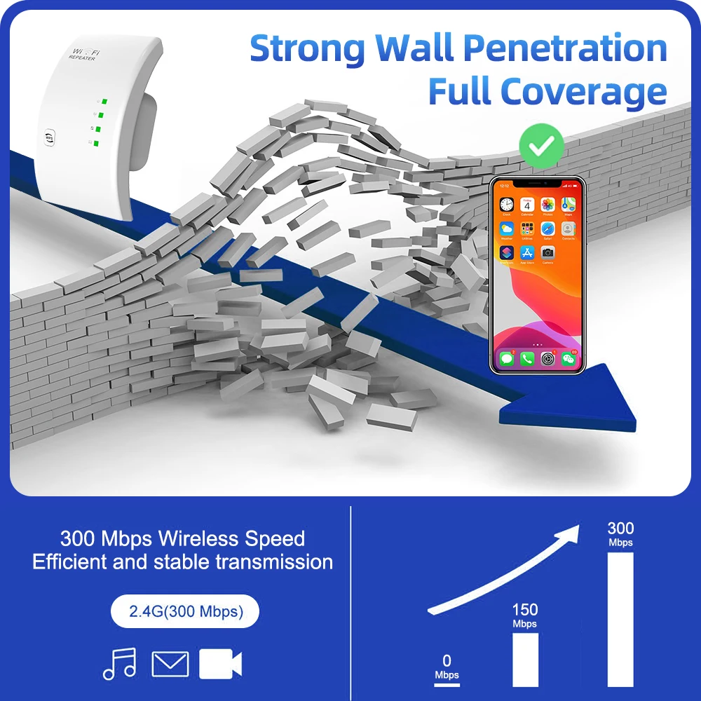 • Long Range Coverage :This WiFi Extender provides ultra-boosted signal strength, covering up to 300 meters, ensuring uninterrupted WiFi access in large areas.