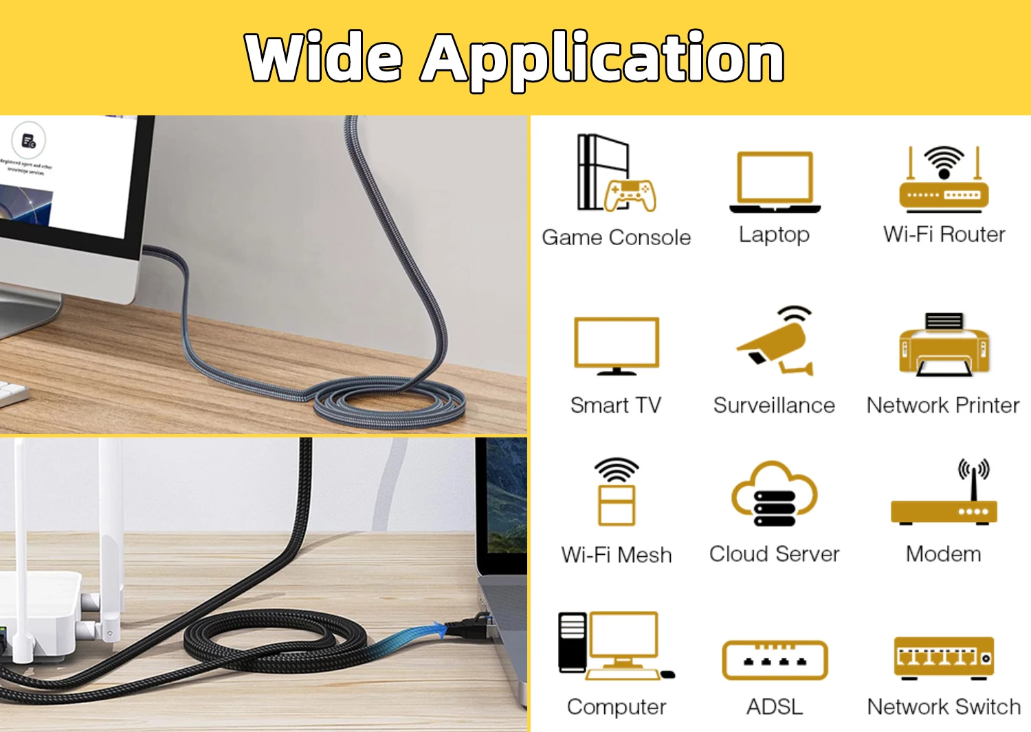 With two shielded RJ45 connectors at both ends,Comparing with other Ethernet cable, Cat8 is thicker, a lot faster and stable in data transferring,which is perfectly suitable for AI smart products. With the RJ45 Connector, network cable can be perfectly compatible with computers, laptops, modems, routers, PS5, X-Box and other networking devices. It is suitable for small or middle enterprise LANs, especially for data center switch-to-server interconnections.It can also be fully backward compatible with Cat7, Cat6e, Cat6, Cat5e, Cat5.