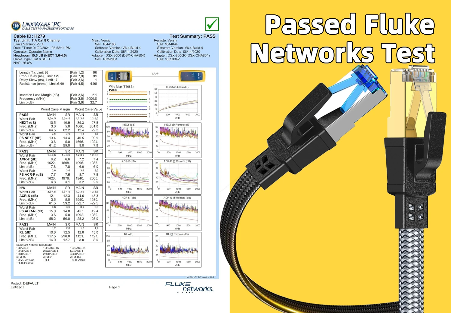 Cat8 flat Internet cable wrapped with quality nylon braided cord, which makes the LAN cable stronger and more durable, flexible and tangle-free. The test proves that this internet cable can be bent at least 10000 times without broken, very suitable for long-term use.