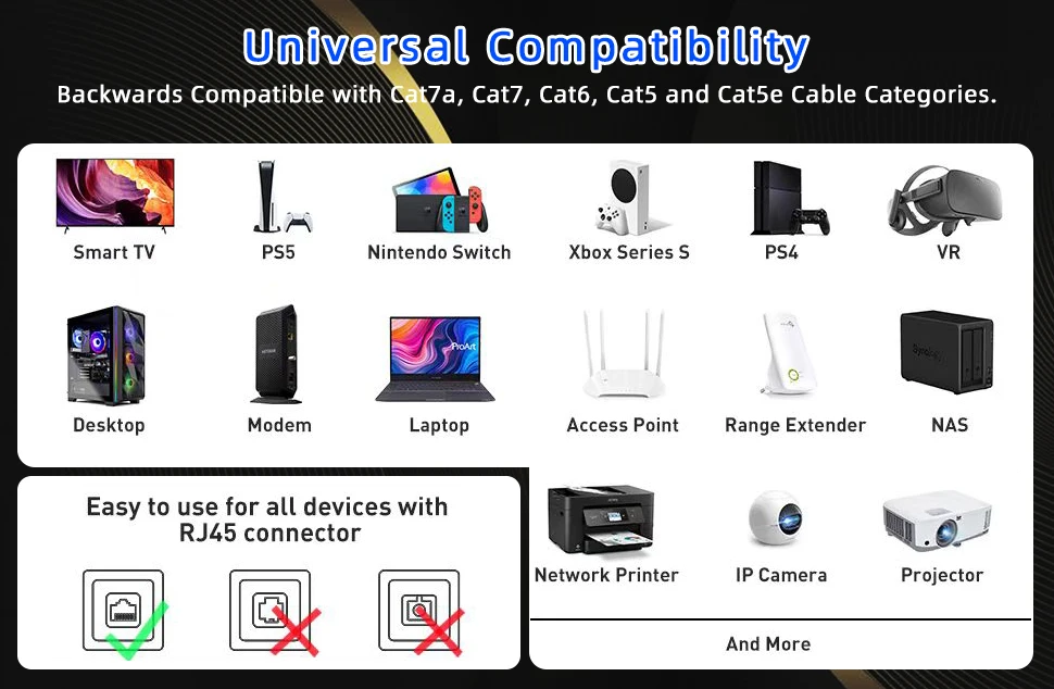 The Cat8 Ethernet cable has two shielded RJ45 connectors on both ends, perfectly compatible with all (cat5, cat5e, cat6, cat6a and cat7) Perfect for PS5, NAS, VoIP, PC, Laptop , modems, DSL routers, switches, network cameras, network printers, servers, game consoles, smart TVs, media players, surround amplifiers, Internet radios, etc.