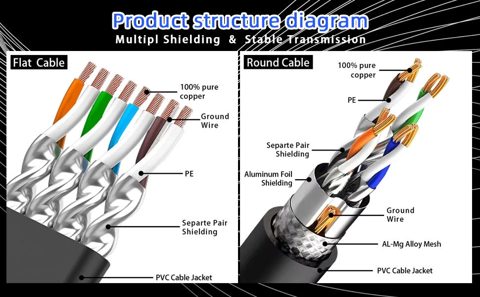 CAT 8 cable consists of double shielded foil and 4 twisted pairs, the perfect splicing quality makes the network cable free from interference from adjacent network cables. cat 8 network cable is made of new environmentally friendly materials, will not be easily broken in high or low temperature environments, the cable is made of high-quality anti-ultraviolet The PVC jacket provides shielding while being weatherproof.
