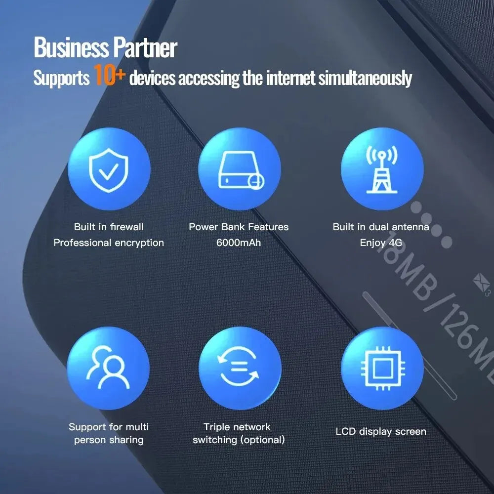 Built in frewall Professional encryption/Power Bank Features 6000mAh/Built in dual antenna Enjoy 4G/Support for multiperson sharing/Triple network switching (optional)/LCD display screen