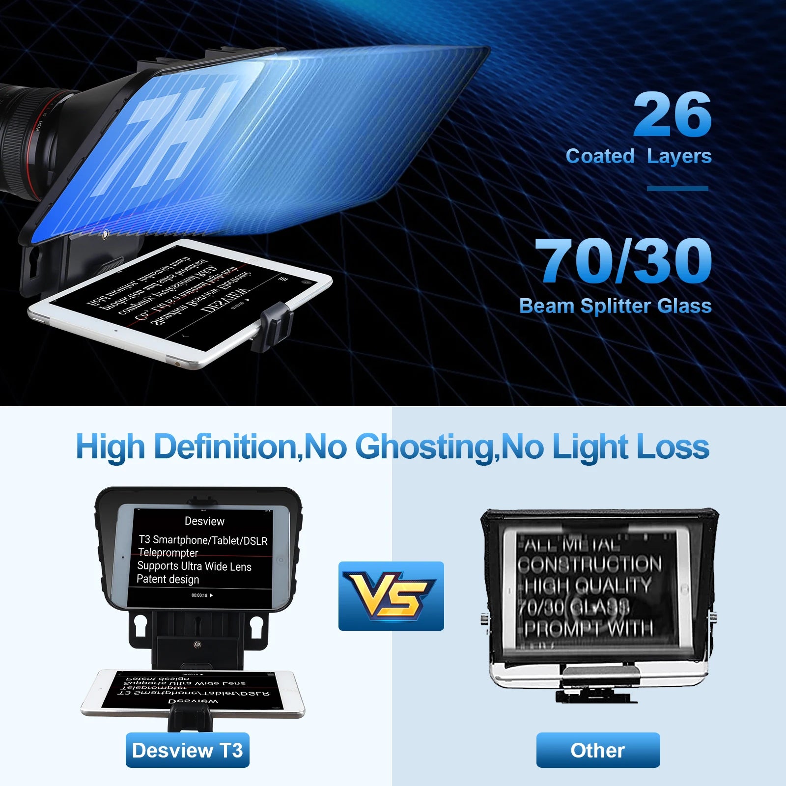 【High Definition Splitter Glass Telepromter】Adopting premium Beam Splitter Glass with 26 coated layers for no light loss, Desview T3 teleprompter kit gives highest definition prompting, easy to read. 7H hardness and the lid of glass protect your teleprompters well during transport and storage.