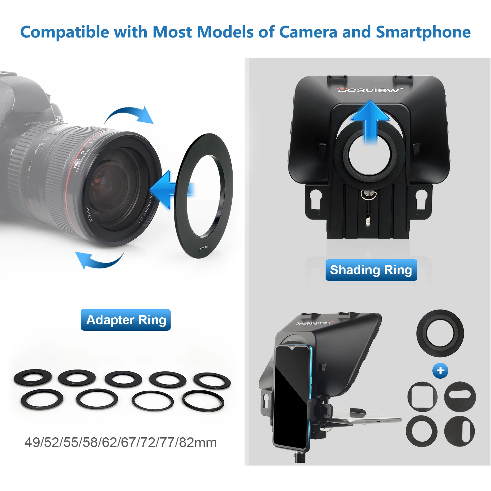 【Wider Angle Bigger View】The T3 teleprompter for iPad Tablet prompting supports more than 24mm horizontal/ shooting and less than 35mm vertical shooting. Teleprompter iphone adopts 49/52/55/58/62/67/72/77/82 mm camera lens adapter rings, making the connection of DSLR and teleprompter very tight.