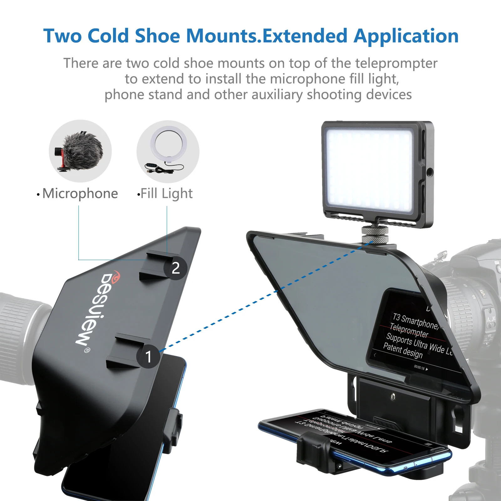 【Up to 11” iPad Prompting with 10Ft Reading Distance】Desview T3 teleprompter for camera is designed to shoot with DSLR/ mirrorless cameras/smartphones; The teleprompter can support for iPad measuring up to 11” such as iPad Air and 11” iPad pro, similar sized tablets and smartphones,not support for 12.9” iPad pro,Teleprompter ipad Built-in two cold shoe mounts on the top for mounting LED lights and microphones.