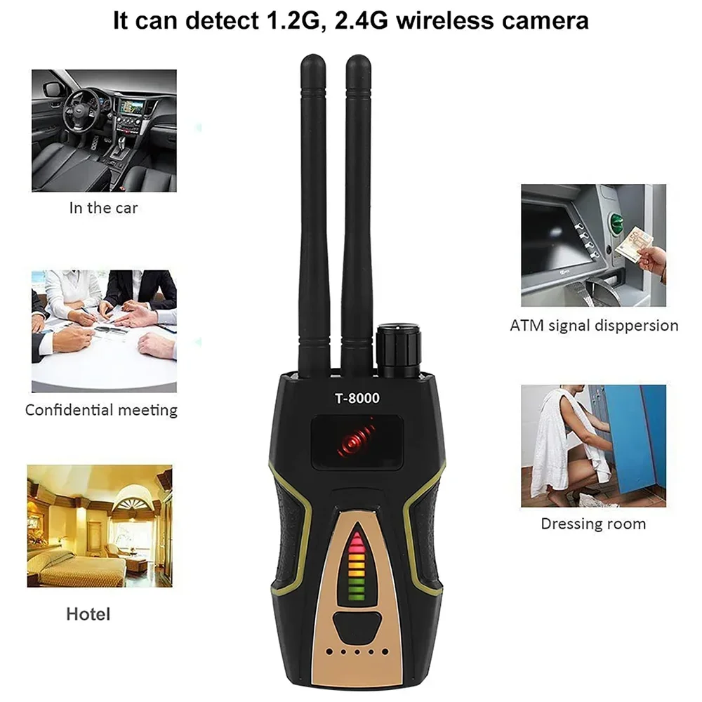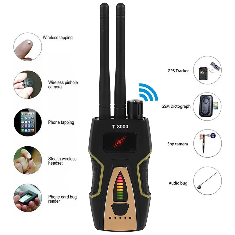 RF Signal Bug Detector, Magnetic Field Detector GPS Detector,Camera Lens Finder Camera Detector,and AI Auto Scan.It detects WiFi Cameras, IP Cameras, Hidden Miniature Cameras,wireless Audio Bugs,GSM bugs,Body Wires,Wiretaps,Mobile Phone Tapping, GPS Trackers,Magnetic GPS Tracking Devices.