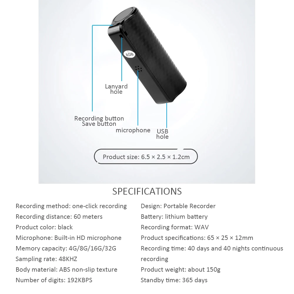 【Compact & Portable】: Small size, its appearance is adopted IML process. The weight is 61g only, easy to carry and hide. The recorder with 8/16/32GB memory capacity, you can use it as a portable recorder to record anything, or use it as a MP3 player to listen to your favorite songs. It can be widely used in classroom, meetings, interviews recording, MP3 music playing and so on.