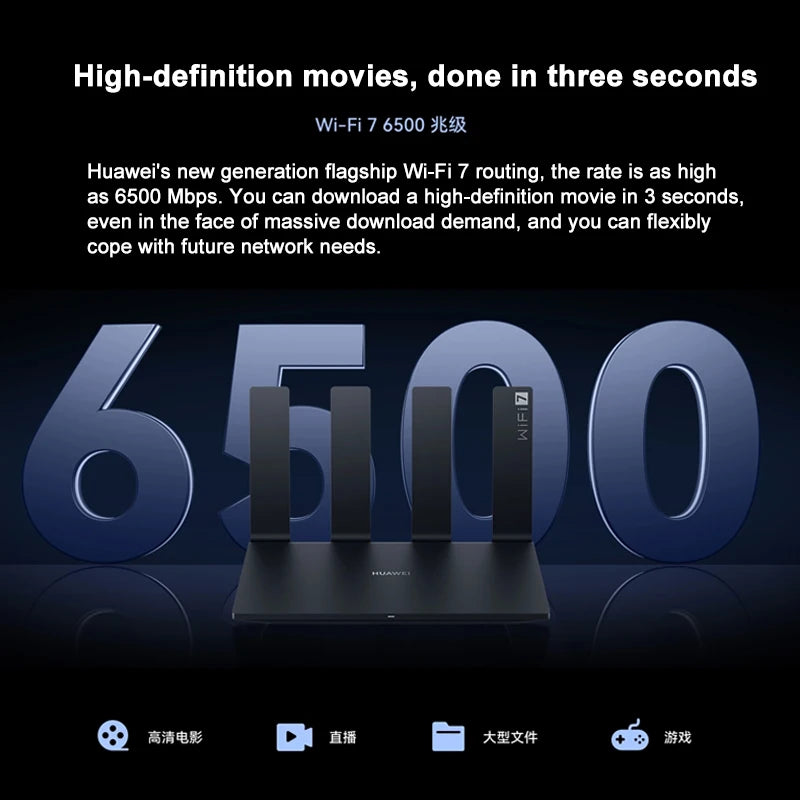 HUAW's new generation flagship Wi-Fi 7 routing, the rate is as high as 6500 Mbps. You can download a high-definition movie in 3 seconds, even in the face of massive download demand, and you can flexibly cope with future network needs.